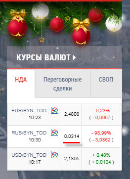 Белорусская валютно-фондовая биржа сообщила, что средневзвешенный курс российского рубля в первых трёх сделках составил всего 0,0314 белорусских рублей за 100 российских. Это в 99,3(!) раза меньше, чем официальный курс российского рубля по мнению Нацбанка Беларуси.
