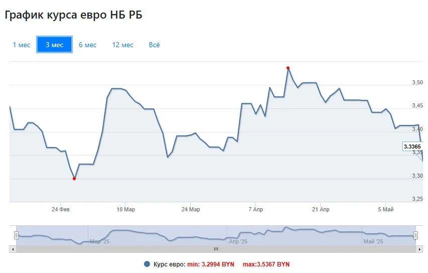 С начала мая официальный курс евро уже обвалился на 0,1308 BYN (-3,8%), а с начала года — на 0,2881 BYN (-7,95%).